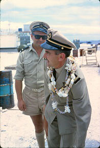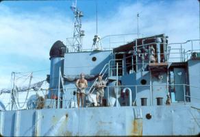 Puis direction Hao ou nous faisons escale les 1 et 2 mars, puis arrivée à Mururoa le 3 mars avec notre chargement de matériel nécessaire pour les tirs.Une fois déchargé le matériel,le Foudre nous a transporté à Papeete ou nous arrivons le 6 mars,après avoir franchi le 146 ème méridien le 5 mars..Le bateau a été mis sur le dock afin d'effectuer les réparations ,suite aux dégats causés par la tempête du départ de Toulon "Plusieurs trous dans la coque dû aux tins,la ligne d'arbre et le gouvernail tribord".De là chargement de matériel et destination Mururoa par nos propres moyens.